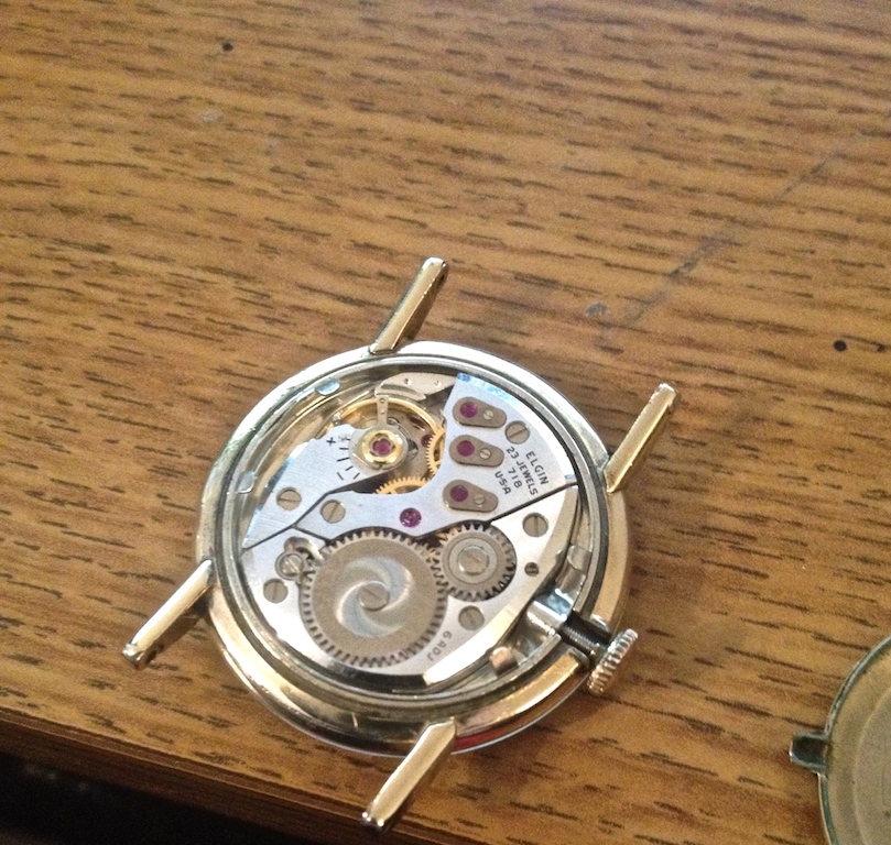 The dial…. It was dirty and cleaned the crud off of it as best I could. Some is just permanent and there are some scraps here and there on the gold finish. One thing I had to do is take the crown and stem off the movement with redone dial and replace the rusty stem that came with the donor movement. The rust gave me pause, and I tore the movement down a bit, but saw absolutely not rust or water damage.