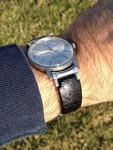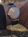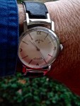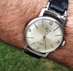 The stainless steel case is sharp, with the brushing still intact. I put it on a 60’s Hadley Roma leather band. Went to Timesaplenty and picked a really nice Kreisler center expansion band with leather inserts. I think it looks really good with this Elgin. Use GS crystal PA 463-11.