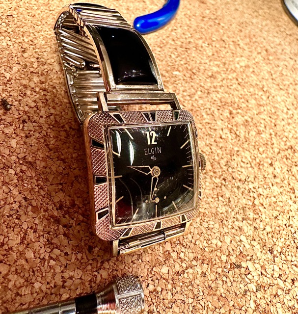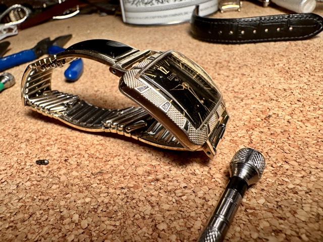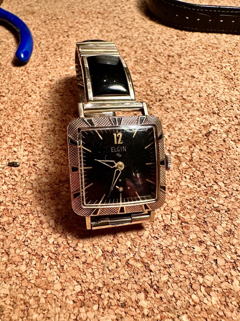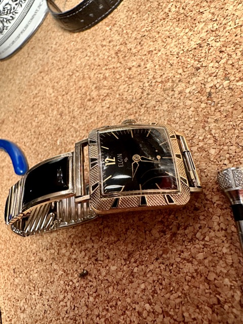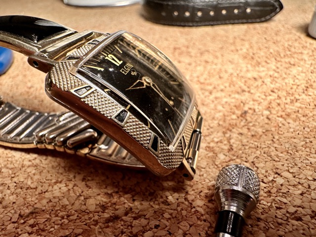 Watch collecting probably should be categorized as a mental illness. I’ve added this Huron to the collection simply because it has the cooler, alternative hands that Elgin used in this model at one point. The case is 9501 and this Huron uses the 17 jewel, 715 movement which I don’t remember seeing before. The watch appears in the 1954 catalogue. The band is Calypso made by Speidel.